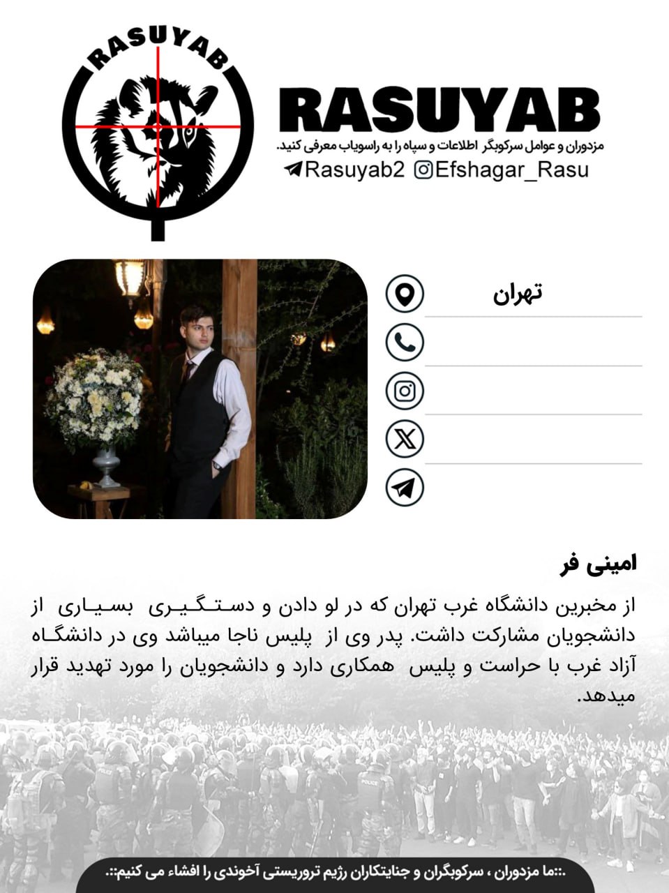 از مخبرین دانشگاه غرب تهران که در لو دادن و دستگیری بسیاری از دانشجویان مشارکت داشت. پدر وی از پلیس ناجا میباشد وی در دانشگاه آزاد غرب با حراست و پلیس همکاری دارد و دانشجویان را مورد تهدید قرار میدهد.