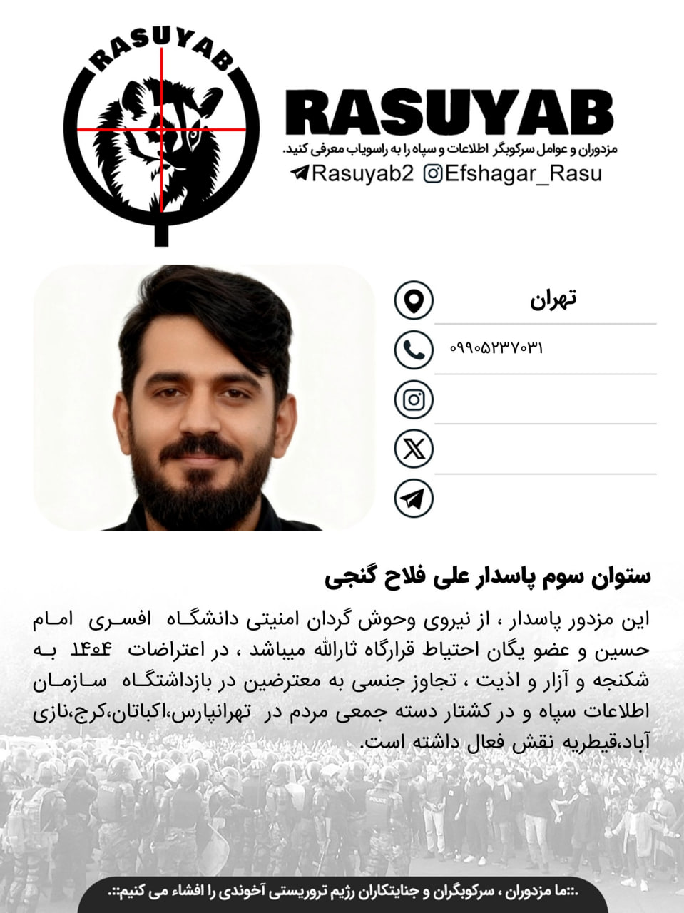 این مزدور پاسدار ، از نیروی وحوش گردان امنیتی دانشگاه افسری امام حسین و عضو یگان احتیاط قرارگاه ثارالله میباشد ، در اعتراضات ۱۴۰۴ به شکنجه و آزار و اذیت ، تجاوز جنسی به معترضین در بازداشتگاه سازمان اطلاعات سپاه و در کشتار دسته جمعی مردم در تهرانپارس،اکباتان،کرج،نازی آباد،قیطریه نقش فعال داشته است.