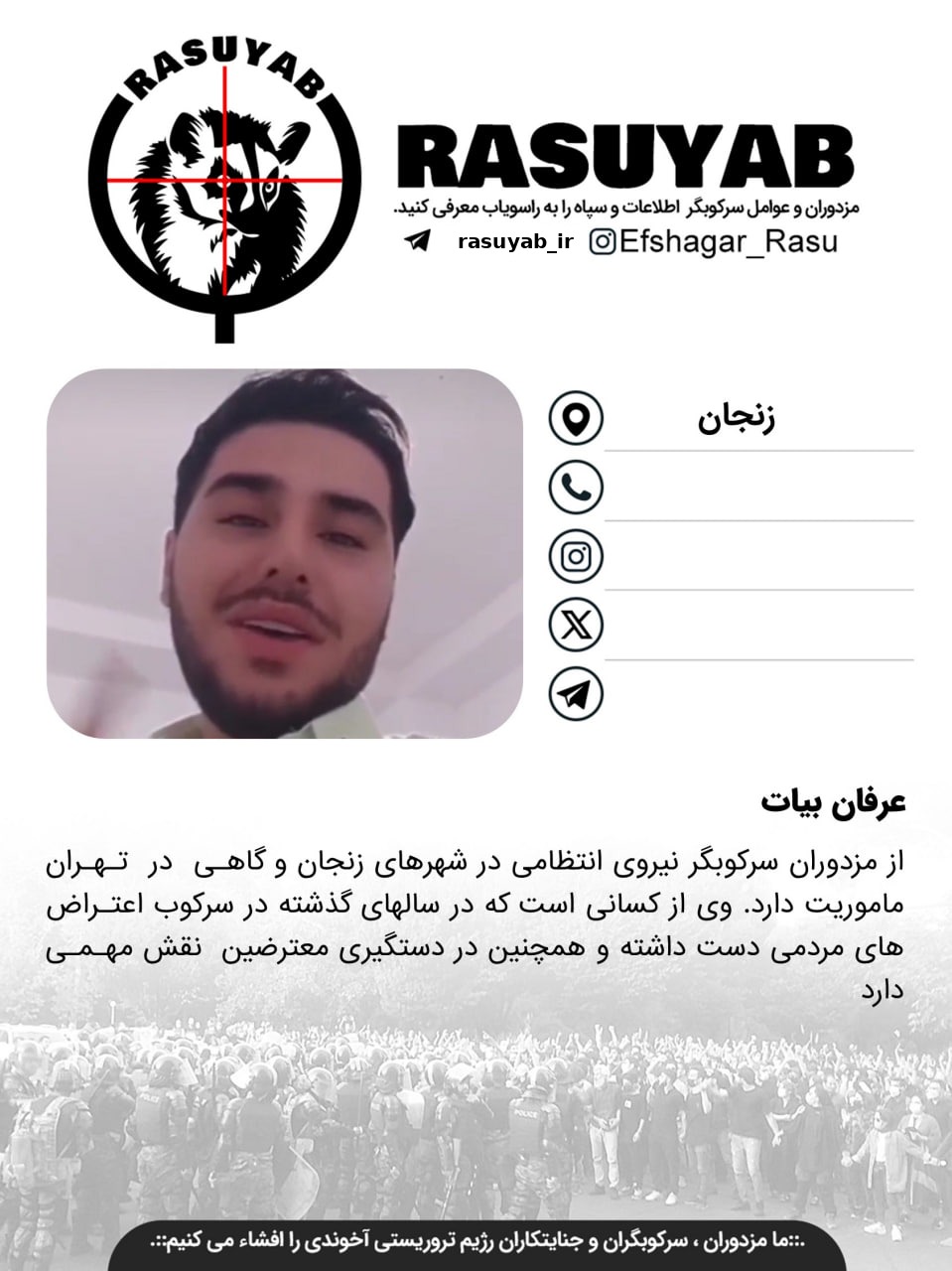 از مزدوران سرکوبگر نیروی انتظامی در شهرهای زنجان و گاهی در تهران ماموریت دارد. وی از کسانی است که در سالهای گذشته در سرکوب اعتراض های مردمی دست داشته و همچنین در دستگیری معترضین نقش مهمی دارد