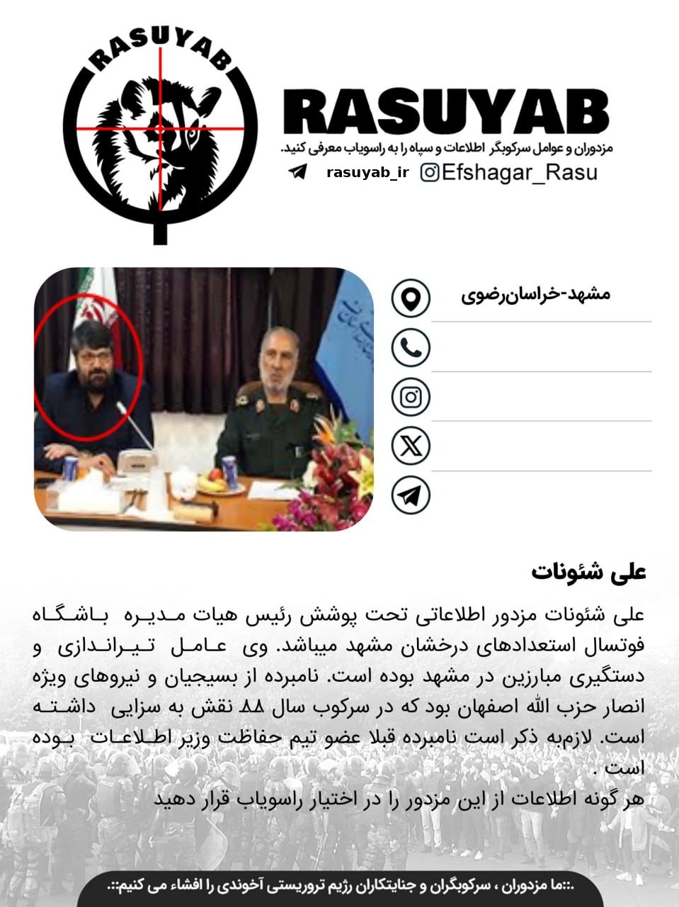علی شئونات مزدور اطلاعاتی تحت پوشش رئیس هیات مدیره باشگاه فوتسال استعدادهای درخشان مشهد میباشد. وی عامل تیراندازی و دستگیری مبارزین در مشهد بوده است. نامبرده از بسیجیان و نیروهای ویژه انصار حزب الله اصفهان بوده که در سرکوب سال ۸۸ نقش به سزایی داشته است. لازمبه ذکر است نامبرده قبلا عضو تیم حفاظت وزیر اطلاعات بوده است. وی هم اکنون در مشهد ساکن است. وی در سالهای ۷۸ تا ۸۱ به عنوان رییس بسیج دانشجوی یکی از واحدهای دانشگاه آزاد بادهمکاری با سازمان اطلاعات سپاه وظیفه دستگیری و شکنجه و بازجویی دانشجویان را به عهده داشته و بسیار مورد نفرت مردم اصفهان بوده و به خاطر همین به تهران و سپس به مشهد روانه شده و در پوشش رئیس هیئت مدیره باشگاه فوتبال مشغول کار میباشد.