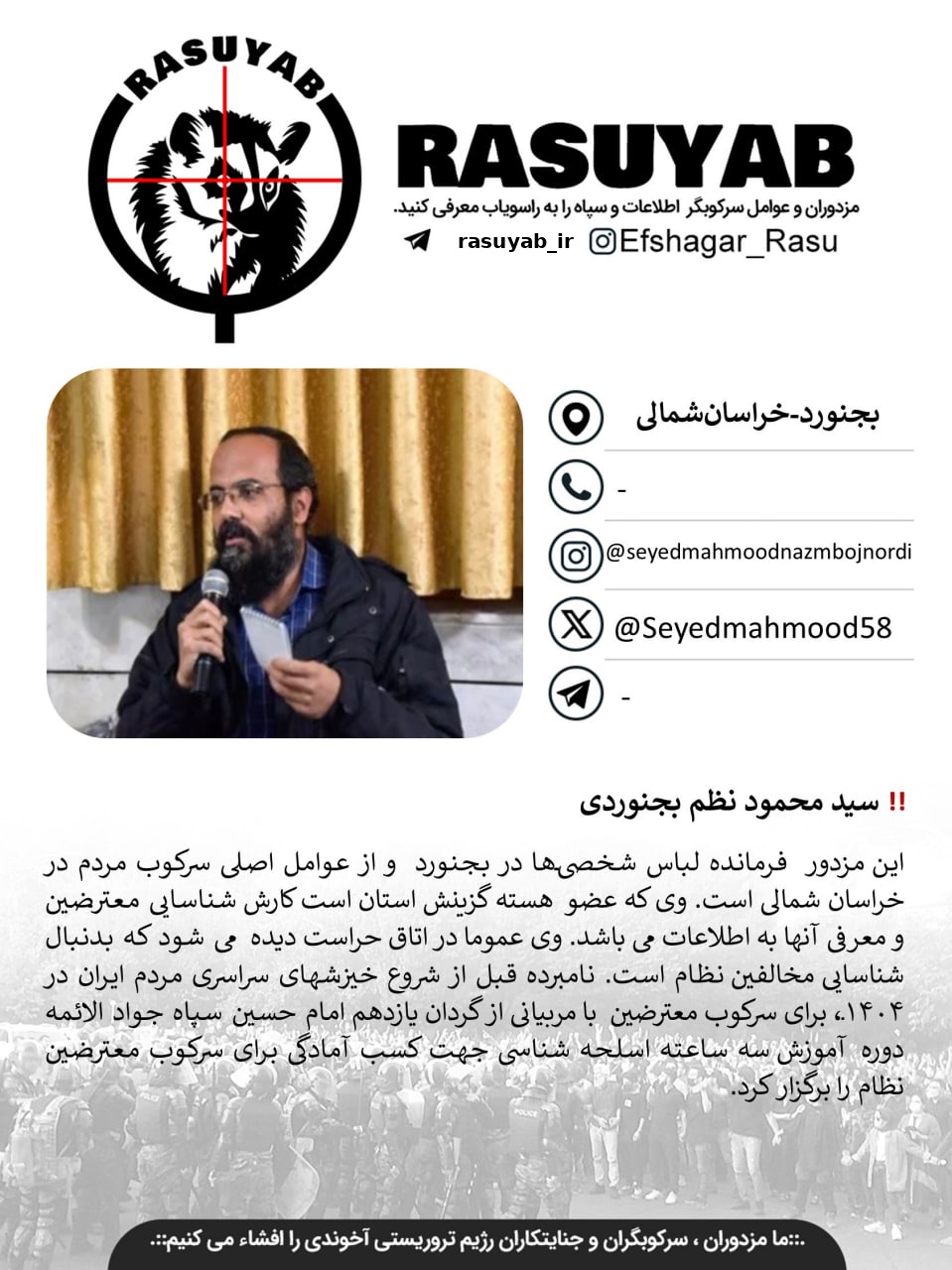 این مزدور فرمانده لباس شخصیها در بجنورد و از عوامل اصلی سرکوب مردم در خراسان شمالی است. وی که عضو هسته گزینش استان است کارش شناسایی معترضین و معرفی آنها به اطلاعات می باشد. وی عموما در اتاق حراست دیده می شود که بدنبال شناسایی مخالفین نظام است. نامبرده قبل از شروع خیزشهای سراسری مردم ایران در ۱۴۰۴، برای سرکوب معترضین با مربیانی از گردان یازدهم امام حسین سپاه جواد الائمه دوره آموزش سه ساعته اسلحه شناسی جهت کسب آمادگی برای سرکوب معترضین نظام را برگزار کرد.