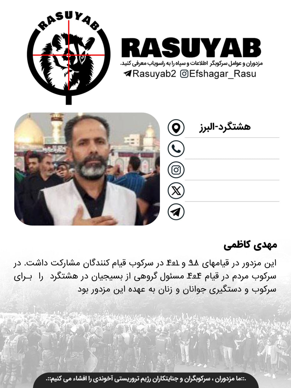 این مزدور در قیامهای ۹۸ و ۴۰۱ در سرکوب قیام کنندگان مشارکت داشت. در سرکوب مردم در قیام ۴۰۴ مسئول گروهی از بسیجیان در هشتگرد را برای سرکوب و دستگیری جوانان و زنان به عهده این مزدور بود